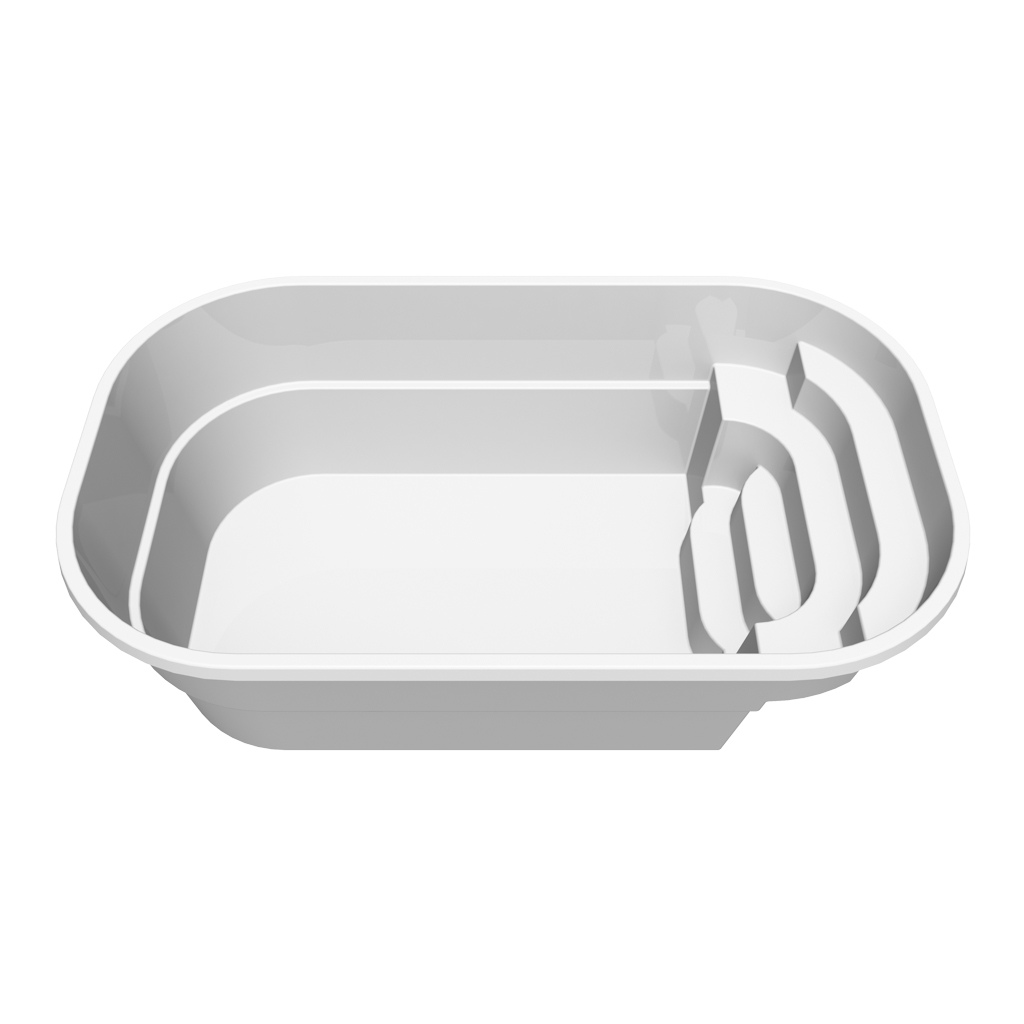 Das Becken bietet große Möglichkeiten für den Einbau von Wasserattraktionen. Die effektvollen Stufen tragen zur eleganten Wirkung des Pools bei und die Antirutsch-Fläche sorgt für Komfort und Sicherheit der Poolgäste. Auf beiden Seiten der Stufen befinden sich bequeme Sitzflächen, die zu einer kurzen Erholung einladen.