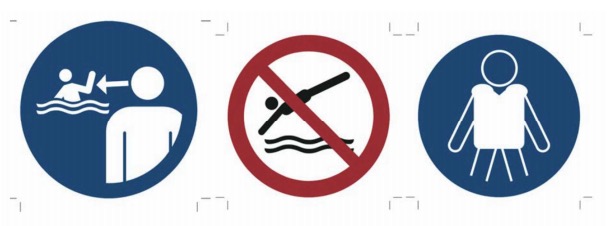Bringen Sie die folgenden Sicherheitszeichen an einer gut sichtbaren Stelle innerhalb von 2 Metern in der Nähe des Schwimmbeckens an.